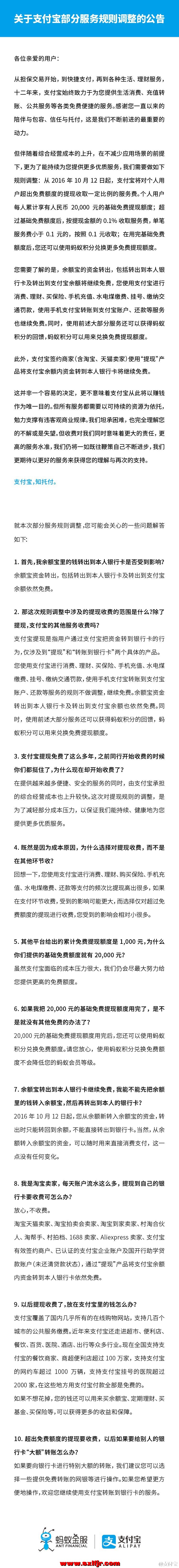 9月12日消息,繼微信3月開始收取提現(xiàn)手續(xù)費(fèi)后,支付寶剛剛發(fā)布公告表示,因綜合經(jīng)營(yíng)成本上升,自2016年10月12日起,支付寶將對(duì)個(gè)人用戶超出免費(fèi)額度的提現(xiàn)收取0.1%的服務(wù)費(fèi),個(gè)人用戶每人累計(jì)享有2萬(wàn)元基礎(chǔ)免費(fèi)提現(xiàn)額度。在用完基礎(chǔ)免費(fèi)額度后,用戶可以使用螞蟻積分兌換更多免費(fèi)提現(xiàn)額度。 支付寶方面表示,最終選擇對(duì)提現(xiàn)而不是在其他環(huán)節(jié)收費(fèi),是因?yàn)橛脩粲弥Ц秾氈Ц兜念l次比提現(xiàn)高出很多。用戶使用支付寶更多是用于各種消費(fèi)、理財(cái)、繳費(fèi)、還信用卡、手機(jī)充值等,提現(xiàn)的需求相對(duì)而言少一些。僅對(duì)提現(xiàn)進(jìn)行收費(fèi),用戶受到的影響會(huì)相對(duì)小很多。 每個(gè)用戶累計(jì)有2萬(wàn)基礎(chǔ)免費(fèi)額度 提現(xiàn)是指用戶通過(guò)第三方支付平臺(tái)把資金轉(zhuǎn)到銀行卡的行為,今年3月,微信已經(jīng)開始對(duì)用戶提現(xiàn)收取0.1%的手續(xù)費(fèi),每位用戶累計(jì)享有1000元免費(fèi)提現(xiàn)額度。 據(jù)介紹,支付寶的提現(xiàn)涉及“提現(xiàn)到本人銀行卡”和“轉(zhuǎn)賬到他人銀行卡”兩個(gè)功能。按照調(diào)整后的規(guī)則,支付寶也對(duì)超出免費(fèi)額度的部分按提現(xiàn)金額的0.1%收取服務(wù)費(fèi),單筆服務(wù)費(fèi)不到0.1元的則按照0.1元收取。支付寶個(gè)人用戶可以累計(jì)享有2萬(wàn)元元基礎(chǔ)免費(fèi)提現(xiàn)額度。 公告顯示,除了提現(xiàn)之外,使用支付寶進(jìn)行消費(fèi)、理財(cái)、購(gòu)買保險(xiǎn)、手機(jī)充值、水電煤繳費(fèi)、掛號(hào)、繳納交通罰款、使用手機(jī)支付寶轉(zhuǎn)賬到支付寶賬戶、還款等服務(wù)不受任何影響,用戶免費(fèi)使用的同時(shí)還可以獲得螞蟻積分。在用完免費(fèi)額度后,用戶累積的螞蟻積分可以用于兌換免費(fèi)提現(xiàn)額度。支付寶方面介紹,目前兌換比例是,1個(gè)螞蟻積分可以兌換1塊錢的免費(fèi)提現(xiàn)額度,上不封頂。 余額寶轉(zhuǎn)出不受影響依然免費(fèi) 此外,對(duì)于余額寶,支付寶公告表示,余額寶資金轉(zhuǎn)出,包括轉(zhuǎn)出到本人銀行卡和轉(zhuǎn)出到支付寶余額將繼續(xù)免費(fèi)。2016年10月12日起,用戶從余額新轉(zhuǎn)入余額寶的資金,轉(zhuǎn)出時(shí)只能轉(zhuǎn)回到余額,不能直接轉(zhuǎn)出到銀行卡。用戶如果余額里有錢擔(dān)心被收費(fèi),現(xiàn)在把錢轉(zhuǎn)入余額寶會(huì)是一個(gè)最佳選擇。 收費(fèi)源自“綜合經(jīng)營(yíng)成本上升較快” 支付寶方面在公告中表示,收費(fèi)的原因是“綜合經(jīng)營(yíng)成本上升較快”,調(diào)整提現(xiàn)規(guī)則是為了減輕部分成本壓力。 而此前,微信宣布提現(xiàn)收費(fèi)時(shí)也表示“并不是追求營(yíng)收之舉,而是用于支付銀行手續(xù)費(fèi)! 馬化騰在今年3月份全國(guó)兩會(huì)時(shí)曾介紹了第三方支付背后的商業(yè)模式:銀行的錢離開銀行體系,進(jìn)入到第三方支付的賬戶,其實(shí)都是要收費(fèi)的,轉(zhuǎn)賬的手續(xù)費(fèi)大約在千分之一左右,這是第三方支付一項(xiàng)很大的成本。據(jù)馬化騰介紹,即使算上第三方支付平臺(tái)可以獲得的利息收入,微信1月份的成本還是超過(guò)3億。 支付寶在公告中表示,對(duì)于超出免費(fèi)額度的提現(xiàn)收費(fèi),這并非一個(gè)容易的決定,更不意味著支付寶從此將以賺錢作為唯一目的!暗蟹⻊(wù)都需要以可持續(xù)的資源為依托,勉力支撐有違客觀商業(yè)規(guī)律! |