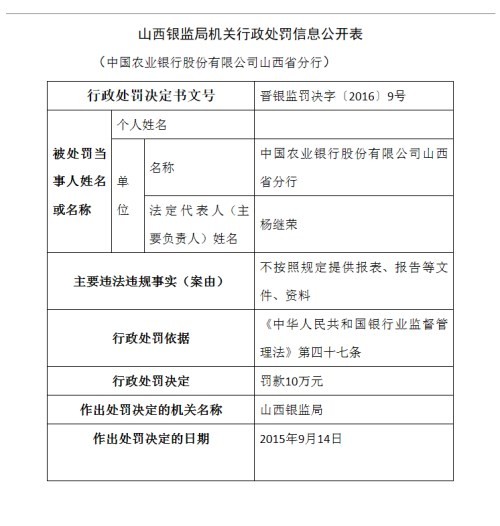 據(jù)銀監(jiān)會(huì)網(wǎng)站10月24日消息,中國(guó)農(nóng)業(yè)銀行股份有限公司山西省分行存在不按照規(guī)定提供報(bào)表、報(bào)告等文件、資料等問(wèn)題,被中國(guó)銀監(jiān)會(huì)山西銀監(jiān)局罰款10萬(wàn)元。 行政處罰依據(jù)為:《中華人民共和國(guó)銀行業(yè)監(jiān)督管理法》第四十七條 以下為處罰原文: 山西銀監(jiān)局機(jī)關(guān)行政處罰信息公開表