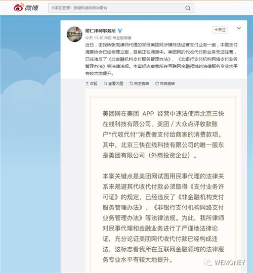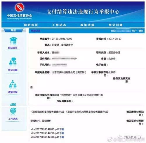 8月30日,微博實名認證的@北京裕仁律師事務(wù)所發(fā)布微博稱,已向中國支付清算協(xié)會實名舉報,美團“代收付款”業(yè)務(wù)涉嫌無證非法經(jīng)營。據(jù)了解,目前中國支付清算協(xié)會官網(wǎng)顯示舉報已經(jīng)受理,正在調(diào)查中。 中國支付清算協(xié)會官網(wǎng)顯示已受理該舉報,并在舉報調(diào)查中(圖片來源:裕仁律師事務(wù)所微博) 根據(jù)舉報材料中的交易記錄及美團網(wǎng)《商戶服務(wù)協(xié)議》,用戶通過美團網(wǎng)購買商家的產(chǎn)品后本應支付給商家的款項由美團點評及其關(guān)聯(lián)公司“北京三快在線科技有限公司”(下稱“三快在線”)截取,并在沉淀一段時間后結(jié)算、支付給商家。 裕仁律師事務(wù)所方面提供舉報材料。舉報材料中指出,根據(jù)美團網(wǎng)“代收付款”業(yè)務(wù)模式,美團網(wǎng)采取大商戶結(jié)算模式,即消費者支付資金先劃轉(zhuǎn)至美團點評或第三方三快在線公司,再由美團點評或第三方三快在線公司結(jié)算給美團網(wǎng)的平臺商戶。 美團的交易記錄顯示,用戶的交易款是由美團的注冊公司三快在線代為收取(圖片來源:裕仁律師事務(wù)所微博) 同時,美團網(wǎng)消費者采用微信或支付寶支付消費金額時,美團網(wǎng)以美團網(wǎng)平臺對接微信或支付寶等支付機構(gòu),截留美團網(wǎng)商戶結(jié)算資金,然后扣除美團網(wǎng)的成本費用(服務(wù)費)后再與商戶結(jié)算。然而,美團點評并未取得金融支付業(yè)務(wù)的許可牌照。 據(jù)此,本案代理律師裕仁律師事務(wù)所張亮認為,根據(jù)《非金融機構(gòu)支付服務(wù)管理辦法》、《非銀行支付機構(gòu)網(wǎng)絡(luò)支付業(yè)務(wù)管理辦法》等法律法規(guī),美團網(wǎng)“代收付款”業(yè)務(wù)的行為,涉嫌無證經(jīng)營支付業(yè)務(wù)的第一類無證經(jīng)營銀行卡收單核心業(yè)務(wù)和第二類無證經(jīng)營網(wǎng)絡(luò)支付業(yè)務(wù),已構(gòu)成非法經(jīng)營行為。 張亮告訴記著,美團此舉相當于把給商戶的備付金和自己的資金混同,存在巨大的金融風險。 針對裕仁律師事務(wù)所的舉報,鳳凰WEMONEY聯(lián)系到美團點評相關(guān)負責人。對方表示,2016年9月,已完成對第三方支付公司錢袋寶的全資收購,獲得第三方支付牌照。從去年9月至今,美團點評已經(jīng)完成了與錢袋寶的系統(tǒng)整合。 值得注意的是,去年,美團因違反《非金融機構(gòu)支付服務(wù)管理辦法》,在沒有第三方支付牌照的情況下從事第三方支付結(jié)算業(yè)務(wù),被媒體曝光。事后,央行約談并叫停了美團支付,美團錢包的充值功能下線。 業(yè)內(nèi)人士指出,去年媒體報道的焦點是美團無證經(jīng)營支付業(yè)務(wù)中的“開立類支付賬戶的電子錢包,具有充值、消費、提現(xiàn)等支付功能”這一違規(guī)行為。但對“代收代付”,即做大商戶結(jié)算這一違規(guī)行為并沒有處理。 此后,美團點評全資收購第三方支付公司錢袋寶,曲線獲得第三方支付牌照。 張亮表示,按照法規(guī)規(guī)定,美團支付想要合規(guī)有兩種方式:一是以美團為主體去申請第三方支付牌照,這樣用三快在線作為收款方是合規(guī)的。二是為美團用戶開設(shè)錢袋寶賬戶,所有收付款全部切換為錢袋寶收款!澳壳翱磥恚缊F收購的錢袋寶成了擺設(shè),仍然沒有解決美團支付違規(guī)經(jīng)營的問題!睆埩琳f。 |