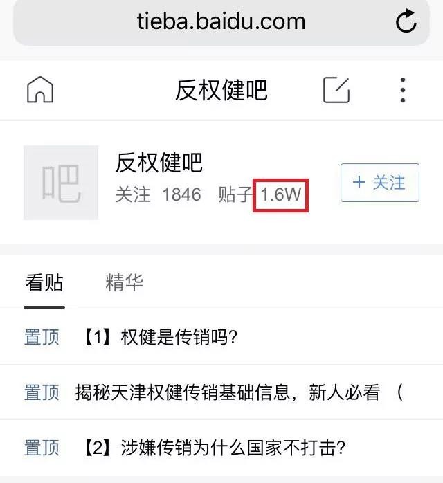 圖片來(lái)源:QQ截圖 百度貼吧里的「反權(quán)健吧」,累積了超過(guò) 1.6 萬(wàn)個(gè)帖子。