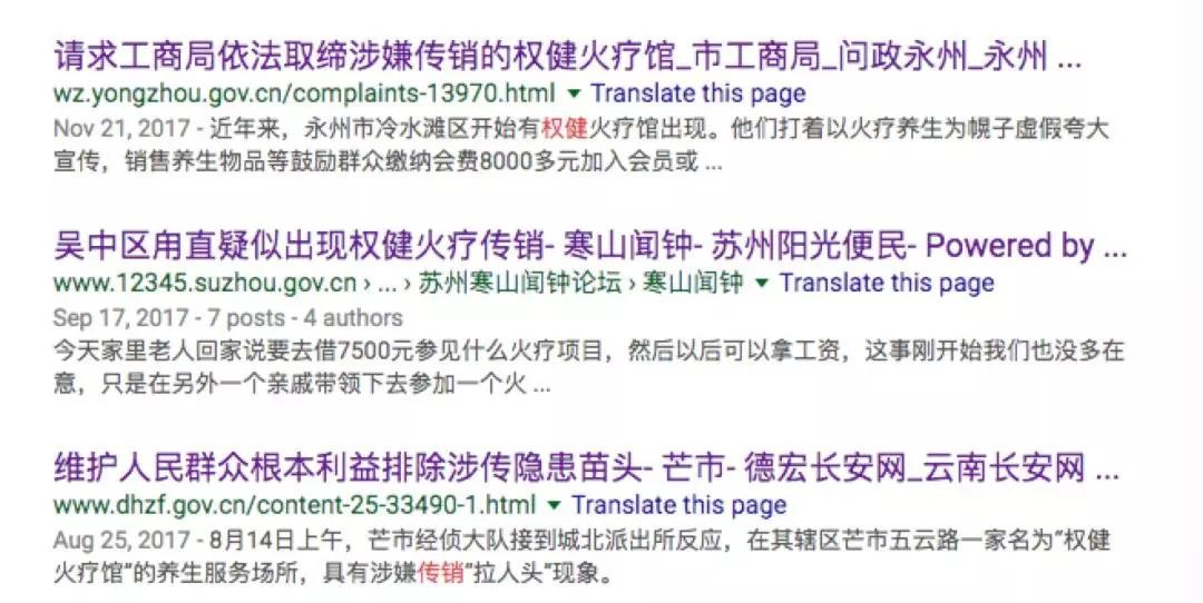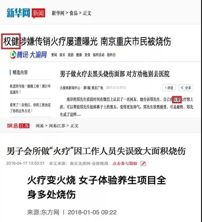 圖片來(lái)源:天眼查截圖 直銷(xiāo)行業(yè)雜志《知識(shí)經(jīng)濟(jì)·中國(guó)直銷(xiāo)》估算:權(quán)健近年的年銷(xiāo)售業(yè)績(jī)均超過(guò)百億規(guī)模。 資金催生出更多的玩法,更精致復(fù)雜的包裝技巧。 2014 年,權(quán)健收購(gòu)天津足球俱樂(lè)部。董事長(zhǎng)束昱輝曾在接受媒體采訪時(shí)放話: 在中國(guó),沒(méi)有足夠的資金和實(shí)力就不要搞足球。 帝國(guó)的門(mén)面變得更好看了。 墜入深淵的受害者和全身而退的權(quán)健 周二力后來(lái)總怪自己無(wú)知,害了女兒,又輸了官司。 但無(wú)力逃脫的并不只是他。 我們?cè)诿襟w報(bào)道和司法判決書(shū)里,統(tǒng)計(jì)了近年來(lái)各地大約 20 起燒傷嚴(yán)重的權(quán)健火療事故,發(fā)現(xiàn)了它們的共同點(diǎn): 這些事故揭露了權(quán)健火療可能存在的風(fēng)險(xiǎn)和后果——嚴(yán)重?zé)齻、高昂的治療費(fèi)、可怕的后遺癥。 經(jīng)銷(xiāo)商通常要為這些事故負(fù)責(zé),而權(quán)健公司全身而退。 比如山東的許女士,3 年前在一起火療中雙腿嚴(yán)重?zé)齻,花?10 多萬(wàn)治療,至今雙腿難以蹲下。 2018 年 7 月,經(jīng)過(guò)兩年艱難的官司,法院判決了經(jīng)銷(xiāo)商負(fù)賠償責(zé)任,但她的律師告訴我們,后者已經(jīng)跑路了。 內(nèi)蒙古一名包姓老人,2016 年在一家火療館(權(quán)健加盟店)做火療時(shí),因工作人員操作不當(dāng),使其心臟病復(fù)發(fā)導(dǎo)致死亡。 盡管火療店經(jīng)營(yíng)者認(rèn)為與其「存在掛靠關(guān)系」的權(quán)健公司也應(yīng)承擔(dān)賠償責(zé)任,但最終法院的判決并未予以支持。 權(quán)健火療導(dǎo)致燒傷新聞 ▼