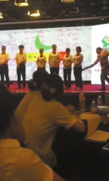 后排員工全被剃成光頭,前排員工被剃成“陰陽頭” 打屁股視頻截圖 剪頭發(fā) 前天晚上開始,一則“山西一銀行培訓(xùn)員工打屁股”的視頻在網(wǎng)絡(luò)熱傳,引發(fā)質(zhì)疑。經(jīng)調(diào)查,視頻中的場(chǎng)景出現(xiàn)在山西長(zhǎng)治漳澤農(nóng)商銀行對(duì)員工開展的“業(yè)績(jī)突破”培訓(xùn)中。目前,官方已叫停培訓(xùn)課程,并對(duì)長(zhǎng)治漳澤農(nóng)商銀行董事長(zhǎng)陳小飛、分管副行長(zhǎng)崔俊安進(jìn)行停職處理。當(dāng)事講師兩度道歉,表示意識(shí)到應(yīng)該改進(jìn)自己的教學(xué)模式。 □視頻 員工當(dāng)眾被打屁股 6月19日晚,一段“銀行員工被當(dāng)眾打屁股”視頻引發(fā)關(guān)注。這段時(shí)長(zhǎng)為1分15秒的視頻顯示,4男4女8名員工橫著一排站在舞臺(tái)中間,一名手持板狀物的男子讓員工依次發(fā)言,講出站在臺(tái)上的原因,員工回答“沒有超越自己”“沒有突破自我”“團(tuán)隊(duì)凝聚力不夠”等。隨后,該男子喊到“準(zhǔn)備好屁股”,便繞到員工背后,開始用一板狀物依次向員工屁股處打去。其中有女員工體力不支,不能站直。最靠右的一位女員工,在第三次挨打后,忍不住用手擋住屁股,該男子呵斥道“把手拿開”。隨著板子落下,這位女員工忍不住朝前邁出一步,并發(fā)出痛苦聲。臺(tái)下傳來唏噓、喊叫聲。 記者注意到,舞臺(tái)上方電子屏上寫有“長(zhǎng)治漳澤農(nóng)商銀行‘業(yè)績(jī)突破’大會(huì)”字樣。 據(jù)知情人介紹,視頻中打人事件發(fā)生在18日晚上,地點(diǎn)是長(zhǎng)治益東酒店一層!爱(dāng)時(shí)漳澤農(nóng)商行正在進(jìn)行員工培訓(xùn),視頻中被打的8名員工都因培訓(xùn)業(yè)績(jī)落后而挨打”。 另一位不愿透露姓名的銀行職工說,銀行經(jīng)常不定期請(qǐng)一些培訓(xùn)機(jī)構(gòu)對(duì)職工進(jìn)行培訓(xùn),視頻中出現(xiàn)的只是一小段,當(dāng)天還有剃光頭等體罰行為出現(xiàn),體罰人數(shù)占銀行員工總?cè)藬?shù)的10%。 知情者提供的當(dāng)天培訓(xùn)照片顯示,16名男性員工分兩排在舞臺(tái)中間合影,后排站著的員工全被剃成光頭,前排坐著的員工被剃成“陰陽頭”。另有多張現(xiàn)場(chǎng)照片顯示,一名男子正拿著工具對(duì)男、女員工修剪頭發(fā)。知情人稱,該男子正是視頻中打人的講師。 □回應(yīng) 銀行稱是培訓(xùn)游戲 昨天上午,記者向漳澤農(nóng)商銀行辦公室求證時(shí),一位不愿透露姓名的女工作人員稱,這是一場(chǎng)培訓(xùn)會(huì),打屁股就是培訓(xùn)過程中設(shè)置的游戲場(chǎng)景之一!俺职遄哟蛉苏呤桥嘤(xùn)老師,不是公司領(lǐng)導(dǎo)層。” 這名工作人員稱,6月18日,銀行舉行了一場(chǎng)培訓(xùn)會(huì),她沒有參加。培訓(xùn)時(shí),員工分了幾個(gè)組。當(dāng)PK結(jié)果出來后,按照培訓(xùn)場(chǎng)景設(shè)置,有的組唱一首《小蘋果》,有的組跳了一支舞,有的組朗誦一首詩歌,而有的組因?yàn)闆]有才藝可表演,于是就自愿表示“我們挨幾下吧”。 這位女工作人員還表示,上班之后,銀行同事也在議論“員工被打屁股”視頻。不過,多數(shù)員工認(rèn)為網(wǎng)上說法太武斷了。 講師稱是教學(xué)手段 昨天下午,新浪微博認(rèn)證為“上海鴻風(fēng)涵遠(yuǎn)商務(wù)咨詢公司董事長(zhǎng)”的網(wǎng)友發(fā)微博稱,上述視頻中“打人”行為與漳澤農(nóng)商行領(lǐng)導(dǎo)無關(guān),是其摸索出來的一種培訓(xùn)模式,稱其“錯(cuò)在用同一種方式去幫助所有的學(xué)員”。 記者通過上述認(rèn)證公司聯(lián)系上博主,確認(rèn)其叫姜洋,系視頻中打人的講師。姜洋承認(rèn)在培訓(xùn)過程中打了8名員工。其稱,視頻中事件發(fā)生在6月18日晚的長(zhǎng)治漳澤農(nóng)商銀行特訓(xùn)營(yíng)課程上。 “老師鼓勵(lì)每個(gè)小組宣布本組的競(jìng)賽名次目標(biāo),同時(shí)宣布完不成目標(biāo)的懲罰措施。最后一名的小組組長(zhǎng)和組員都要受到懲罰。”姜洋說,課程第一天的講解內(nèi)容結(jié)束,要兌現(xiàn)目標(biāo)承諾和執(zhí)行競(jìng)賽規(guī)則的時(shí)候,視頻中這一組是得分最后一名的所有組員,按課堂競(jìng)賽規(guī)定需要打板子。 姜洋稱,培訓(xùn)的目的是通過課程講解和鼓勵(lì)小組間的競(jìng)賽,來觸動(dòng)學(xué)員僵化的思維模式和心智模式。 記者詢問,員工事先是否了解被打的規(guī)則,姜洋回應(yīng)稱,這是課堂中競(jìng)爭(zhēng)規(guī)則,曾反復(fù)提醒學(xué)員。記者就網(wǎng)友質(zhì)疑打員工是否為體罰詢問姜洋,其稱,網(wǎng)傳視頻里內(nèi)容是培訓(xùn)的一個(gè)環(huán)節(jié),此時(shí)的“體罰”是一種教學(xué)手段,就是一種“致良知”的方式。 □處理 董事長(zhǎng)、分管副行長(zhǎng)停職 昨天,長(zhǎng)治市政府新聞辦公室通報(bào)稱,6月18日,長(zhǎng)治漳澤農(nóng)商銀行為提升員工業(yè)務(wù)素質(zhì),自行聘請(qǐng)了上海鴻風(fēng)領(lǐng)導(dǎo)力學(xué)院,對(duì)全行員工開展以“業(yè)績(jī)突破”為主題的員工技能培訓(xùn)。 培訓(xùn)方將參訓(xùn)員工分為27個(gè)小組,每組8人,共計(jì)216人進(jìn)行了業(yè)務(wù)技能培訓(xùn)。當(dāng)晚11時(shí),培訓(xùn)方老師姜洋公布了當(dāng)日技能培