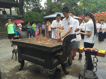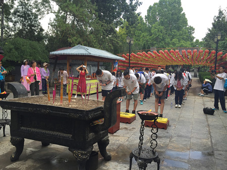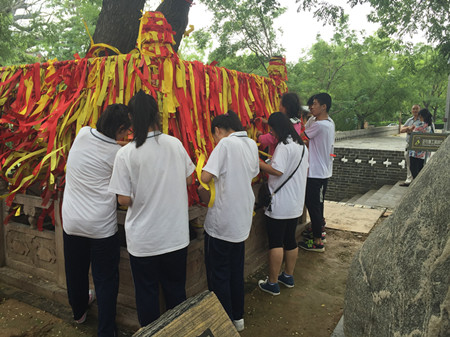 7月20日上午,來自北京勁松職高的70余名高一學(xué)生在老師的帶領(lǐng)下來到洪洞大槐樹景區(qū)開展傳統(tǒng)文化研學(xué)活動,在景區(qū)講解員的帶領(lǐng)下,同學(xué)們開啟了一場奇妙的根祖文化之旅。 在根字影壁前,景區(qū)講解員向同學(xué)們詳細(xì)講解了“根”字的由來以及“根”所蘊(yùn)含的意義,讓同學(xué)們對根祖圣地洪洞大槐樹有了初步的了解;在移民浮雕圖前,同學(xué)們又對大槐樹移民過程進(jìn)行了詳細(xì)的學(xué)習(xí),明白了六百年前移民先祖是怎樣一步一步從大槐樹下遷往全國各地的,一幅幅移民畫面生動的浮現(xiàn)于同學(xué)們的腦海中;在古大槐樹處,一場精心準(zhǔn)備、富含根祖文化特色的祈;顒右褳榍皝韺じ耐瑢W(xué)們準(zhǔn)備就緒,在儀式通贊的主持下,同學(xué)們向古大槐樹敬香、鞠躬、祈愿,并將寄托自己心愿的祈福帶虔誠的系于二、三代大槐樹下,愿移民先祖保佑能夠?qū)W業(yè)有成、金榜題名。祈福儀式結(jié)束后,同學(xué)們在講解員的指引下來到了孝德廣場,這里的孝文化展吸引同學(xué)們駐足、研究,一個個富含孝道文化的故事使得同學(xué)們深受啟發(fā)……“近幾年,李克強(qiáng)總理不斷的提倡我們要學(xué)習(xí)、弘揚(yáng)優(yōu)秀傳統(tǒng)文化,我們這次活動就是響應(yīng)總理號召,利用同學(xué)們的暑假時(shí)間,讓同學(xué)們對中國傳統(tǒng)文化進(jìn)行一次全面、深入的了解與認(rèn)識,來大槐樹就是讓同學(xué)們了解根祖文化、移民文化、姓氏文化,然后將這種文化傳承下去”帶隊(duì)的呂老師如是說。 洪洞大槐樹作為根祖圣地、華人老家,多年來致力于根祖文化的研究,肩負(fù)著將這一傳統(tǒng)文化延續(xù)、傳承的光榮使命,其獨(dú)具特色的根祖文化內(nèi)涵吸引了數(shù)以億記的大槐樹移民后裔前來尋根祭祖旅游觀光,今年暑期結(jié)合中國傳統(tǒng)孝道文化開展的首屆孝文化節(jié)更是吸引了廣大的莘莘學(xué)子前來學(xué)習(xí)、研究,并在日常生活、學(xué)習(xí)中用自己的一言一行將古代傳統(tǒng)孝文化不斷傳承下去。 |